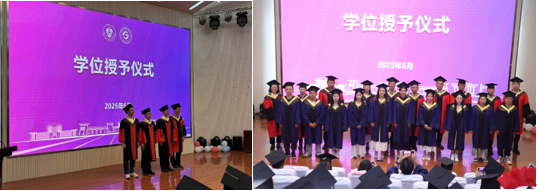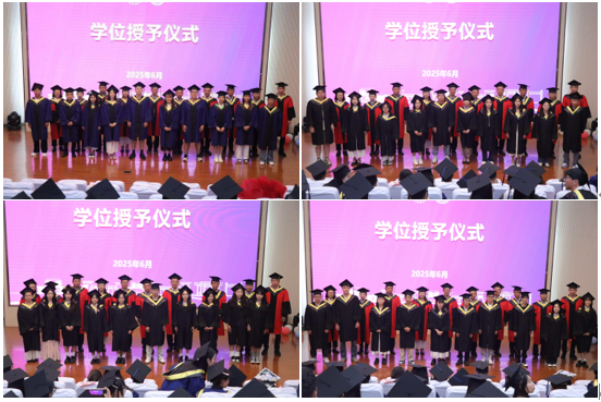 在授予学位环节,毕业生们身着博士服、硕士服和学士服井然有序地上台接受学位授予,公司11位博士生导师分17批次为博士、硕士和本科毕业生拨穗正冠,并合影留念。