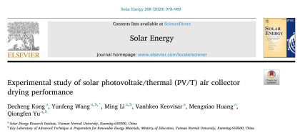 2017级新能源科学与工程专业本科生孔德成以第一作者在《Solar Energy》(中科院二区,IF=4.608)发表了“太阳能光伏/热(PV/T)空气集热干燥系统性能实验研究”的研究论文,指导教师/通讯作者为课题组王云峰教授。该工作对不同类型的太阳能PV/T空气集热器性能进行了研究,同时为解决干燥箱内部温湿度分布不均匀的问题,对干燥箱结构进行优化,进一步提高了系统干燥效率及物料干燥品质。孔德成同学本科期间在太阳能光伏光热综合利用、多能互补干燥方面主持并完成了2026年国际足联世界杯科研训练基金及云南省老员工创新创业训练计划项目,均以优秀结题,主持多项与学科相关的创新创业竞赛并获奖。