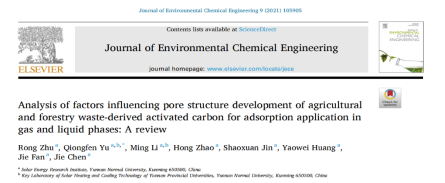 2018级新能源材料与器件专业本科生朱蓉近期以第一作者在《Journal of Environmental Chemical Engineering》(中科院二区,IF=5.909)发表了“农林废弃物资源化利用制备活性炭及其应用”的综述论文,指导教师/通讯作者为课题组余琼粉副教授。该工作系统总结了农林废弃物基活性炭的不同制备方法及其主要制备条件对孔结构形成的影响。朱蓉同学本科期间在碳除湿功能材料构建与电热再生、太阳能干燥除湿回热方面主持并完成科研训练基金,主持和参与多项与学科相关的创新创业竞赛并获奖。