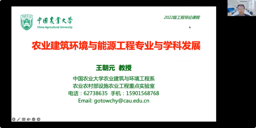 10月27日上午,中国农业大学农业建筑与环境工程系教授、博士生导师、水利与土木工程公司副经理王朝元教授应邀通过腾讯会议对公司农建专业本科生进行线上授课,教学内容为工程导论中“农业建筑环境与能源工程专业与学科发展”。公司2022级农业建筑环境与能源工程专业本科生在公司103教室进行线下集中听讲。线下课程由公司农业建筑环境与能源工程专业负责人尹芳教授主持。