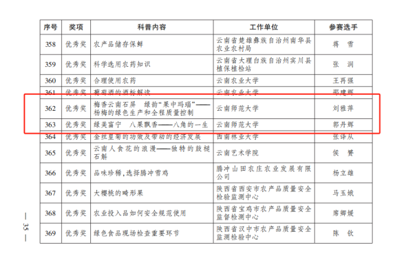 近日获悉,在农业农村部农产品质量安全监管司举办的首届全国农产品质量安全科普大赛中,来自公司“云南省农业废物智慧低碳利用关键技术及装备研发创新团队”农业硕士报送的2个作品,从全国518个参赛作品中脱颖而出,喜获优秀奖。