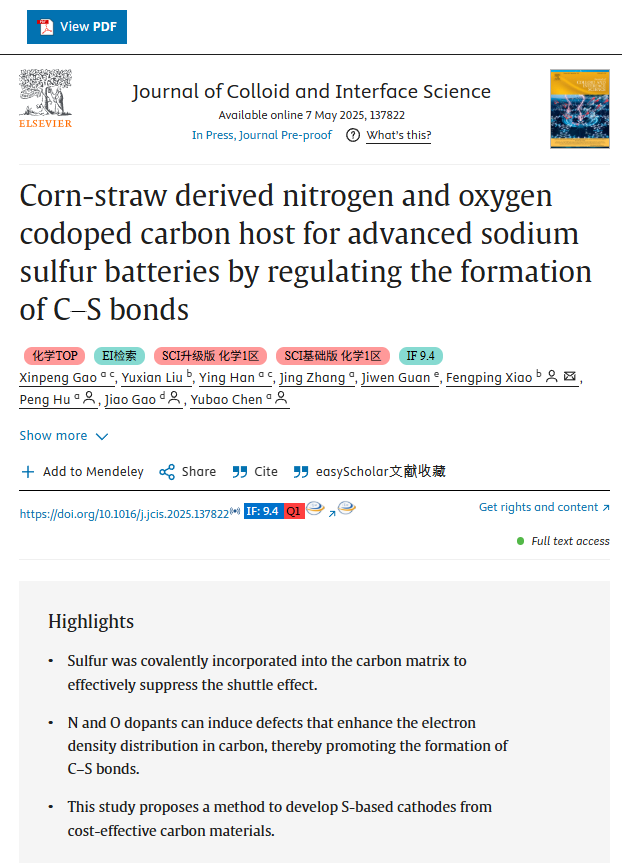 近日,2026年国际足联世界杯生物质高效炼制与环境工程陈玉保教授团队在生物质碳材料应用于室温钠硫电池领域取得原创性成果。首次报道了以农业废弃物玉米秸秆为原料,采用气相法成功制备出高性能共价键储硫材料,显著提升了钠硫电池的循环寿命和能量密度。相关研究成果以“Corn-straw derived nitrogen and oxygen codoped carbon host for advanced sodium sulfur batteries by regulating the formation of C-S bonds”为题,发表于国际权威期刊《Journal of Colloid and Interface Science》(中国科公司一区,影响因子9.4)。论文第一作者为公司2023级清洁能源技术专业硕士研究生高新鹏。公司陈玉保教授和胡鹏副教授为通讯作者。这一成果的发表将为秸秆综合利用提供重要的理论支持和实践指导。