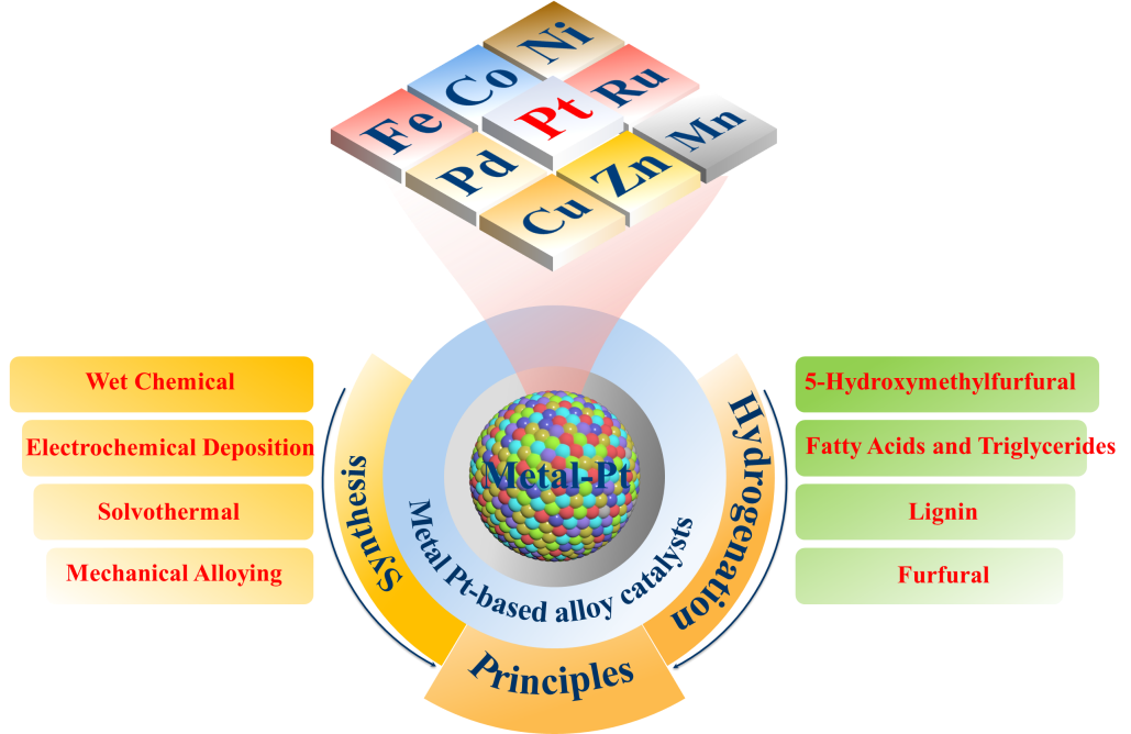 Pt系合金催化剂因其调节电子结构的独特能力以及高催化活性和选择性,在生物质氢化方面展现出巨大潜力。本文系统综述了Pt基合金催化剂合成技术及其在生物质衍生平台分子氢化中的应用与多尺度合成策略,包括湿化学法、溶剂热法、电化学沉积法和机械合金化法,可以精确调节催化剂表面的原子排列、合金成分和缺陷结构,达到优化反应路径并最小化副反应。