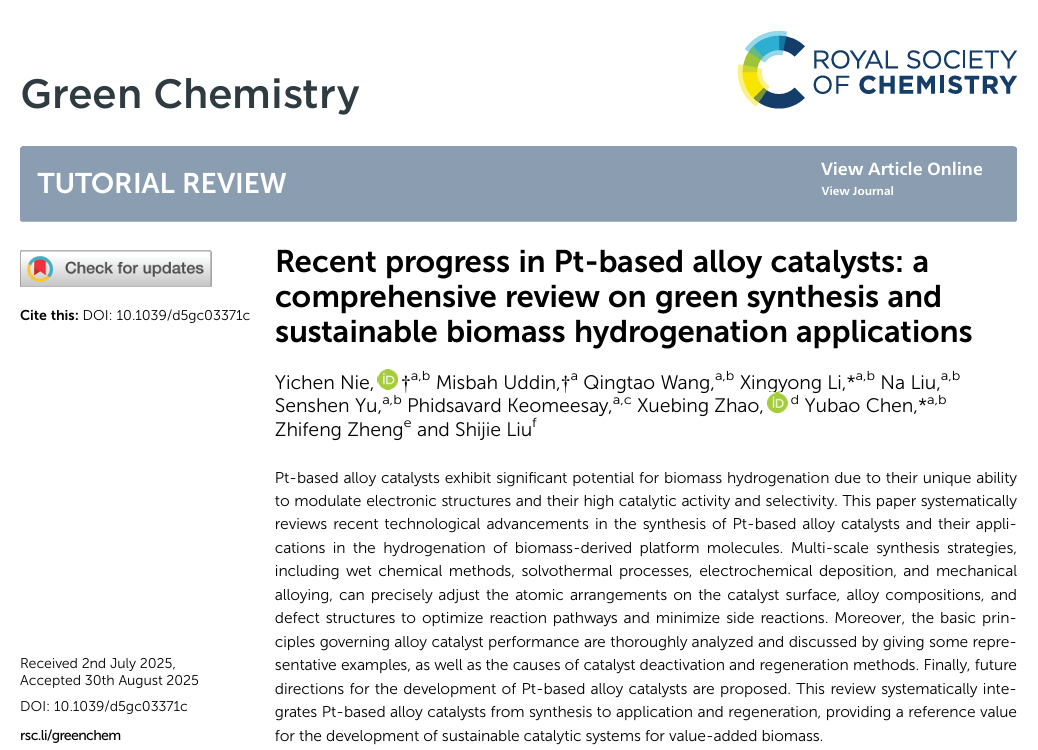 近期,国际知名期刊《Green Chemistry》在线发表了2026年国际足联世界杯生物质高效炼制与环境工程团队在生物质加氢领域取得的综述性研究成果,论文题目:《Recent progress in Pt-based alloy catalysts: a comprehensive review on green synthesis and sustainable biomass hydrogenation applications》(中国科公司一区TOP,影响因子IF = 9.3)。论文链接: https://doi.org/10.1039/d5gc03371c,公司硕士研究生聂懿宸为论文的第一作者,青年教师李兴勇博士、经理陈玉保教授为论文共同通讯作者。论文得到了清华大学赵雪冰教授、厦门大学郑志峰教授、纽约州立大学Shijie Liu教授的指导。