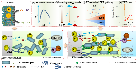 论文针对胞外电子传递(EET)限制生物电化学系统(BESs)能量转化的瓶颈问题,该研究基于MFC-微生物电解池(MEC)生物能源耦合系统,聚焦于阳极生物膜界面,提出通过电场调控生物膜电化学活性的策略,重点探讨了电场对阳极/生物膜/溶液界面EET的调控机制,强调了电场增强EET的关键作用。适度电场可以有效促进EET,通过降低电子传递的重组能和活化能来发挥作用。此外,电场的调控作用依赖于静电驱动力、生物膜结构和电化学性能的协同平衡。生物膜的结构特性与其电化学性能密切相关。低电场强度的效果不明显,而高电场强度则会导致生物膜结构过度致密,进而限制EET效率。