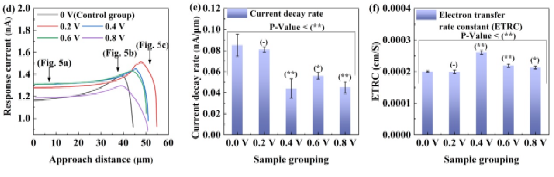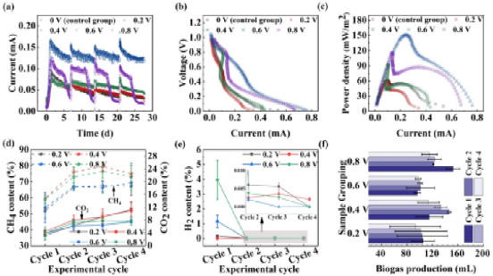 研究结果显示,电场调控表现为非线性特征,系统在0.4 V时表现出最高的输出电流,达0.19 mA,较对照组提升97.9%,并获得的最大功率密度为151.49mW/m⟡,是对照组的2.45倍,同时表现出最优的甲烷合成性能,实现了高效的EET过程,展示了电场促进EET的潜力,为BESs的界面工程提供了协同调控的实践参考。