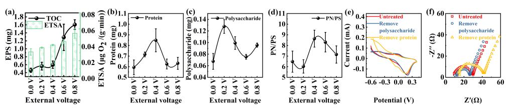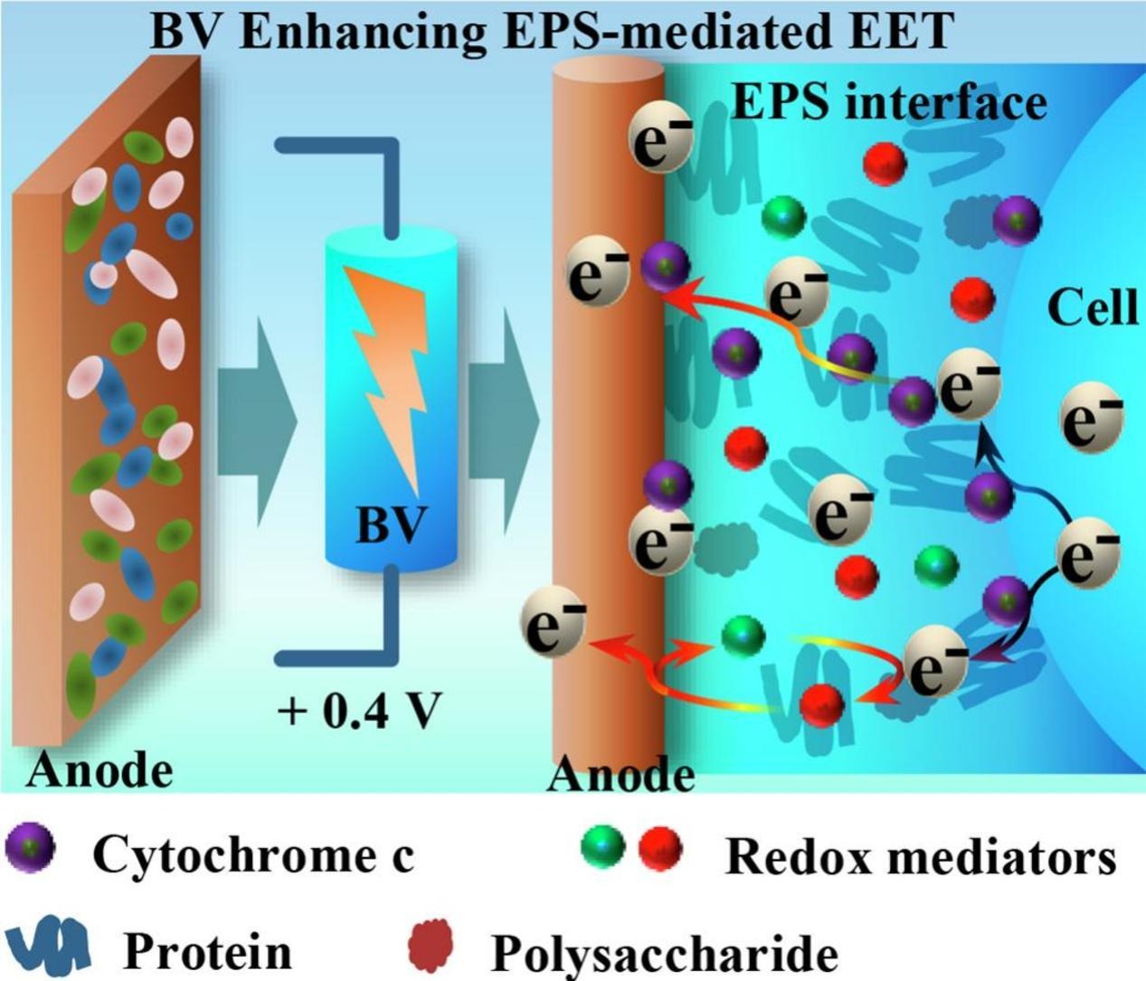 尽管电场作为物理刺激已被证实可增强EET过程,但其潜在机制尚不明确,这制约了生物电化学系统性能的进一步提升。EPS作为生物膜与电极之间的关键界面,构成了EET必须穿越的物理屏障,其电化学特性直接影响EET效率。然而,在电刺激条件下EPS如何介导EET仍缺乏清晰认识。为此,该研究重点探讨了EPS组成、电化学活性及结构在BV条件下的响应规律及其介导EET过程的调控机制。