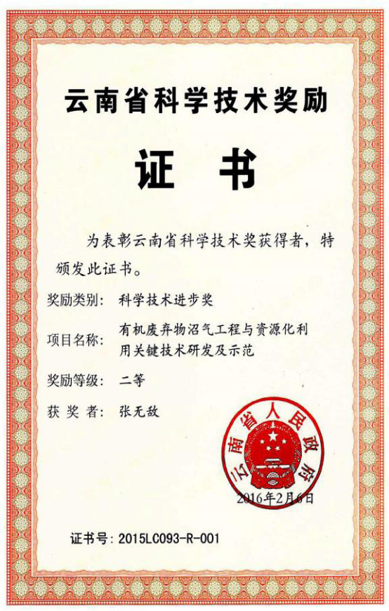 沼气技术和循环农业模式应用于农业废弃物处理和资源化利用获得云南省2015年云南省科技进步“二等奖”