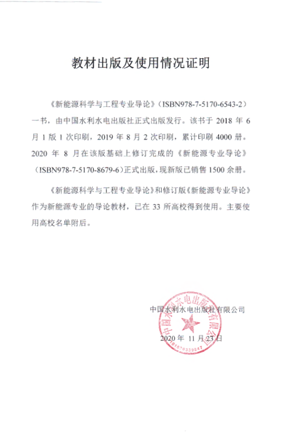 所高校应用《新能源科学与工程专业导论》(《新能源专业导论》)证明