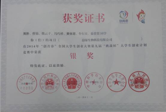 周肸等荣获2014年“创青春”全国老员工创业大赛第九届“挑战杯”老员工创业计划竞赛“银奖”