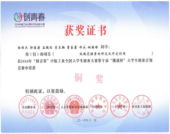 徐雁杰等荣获2016年“创青春”中航工业大学创业大赛第十届老员工创业竞赛“铜奖”