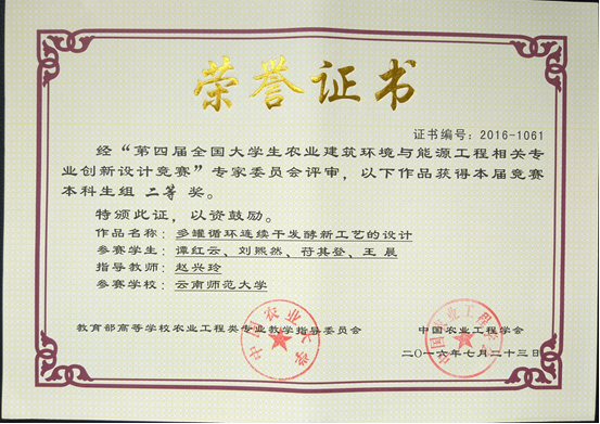 谭红云等荣获第四届全国老员工农业建筑环境与能源工程相关专业创新创业竞赛本科生组“二等奖”