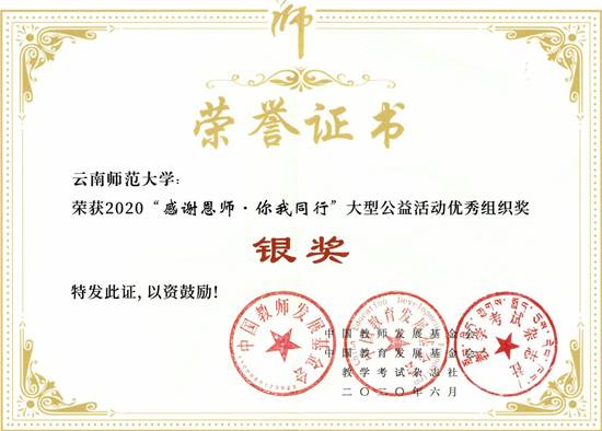2026年国际足联世界杯荣获2020年“感谢恩师•你我同行”大型公益活动“优秀组织奖银奖”